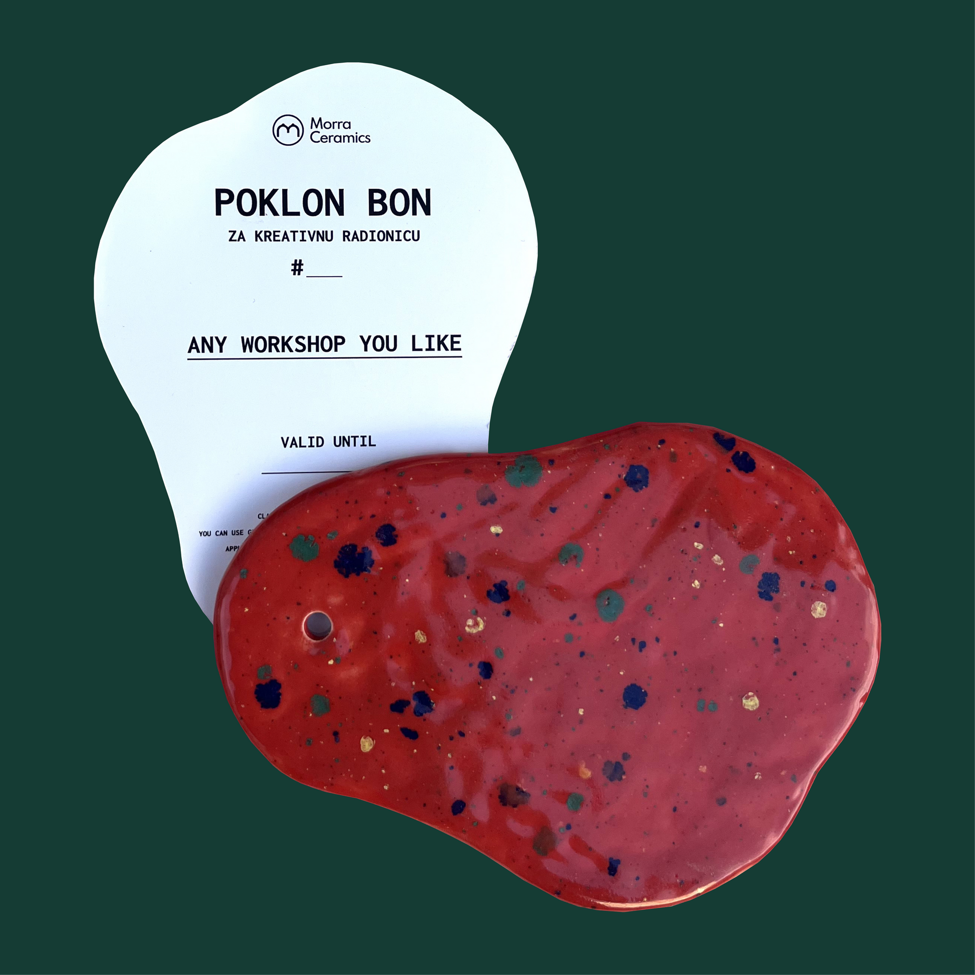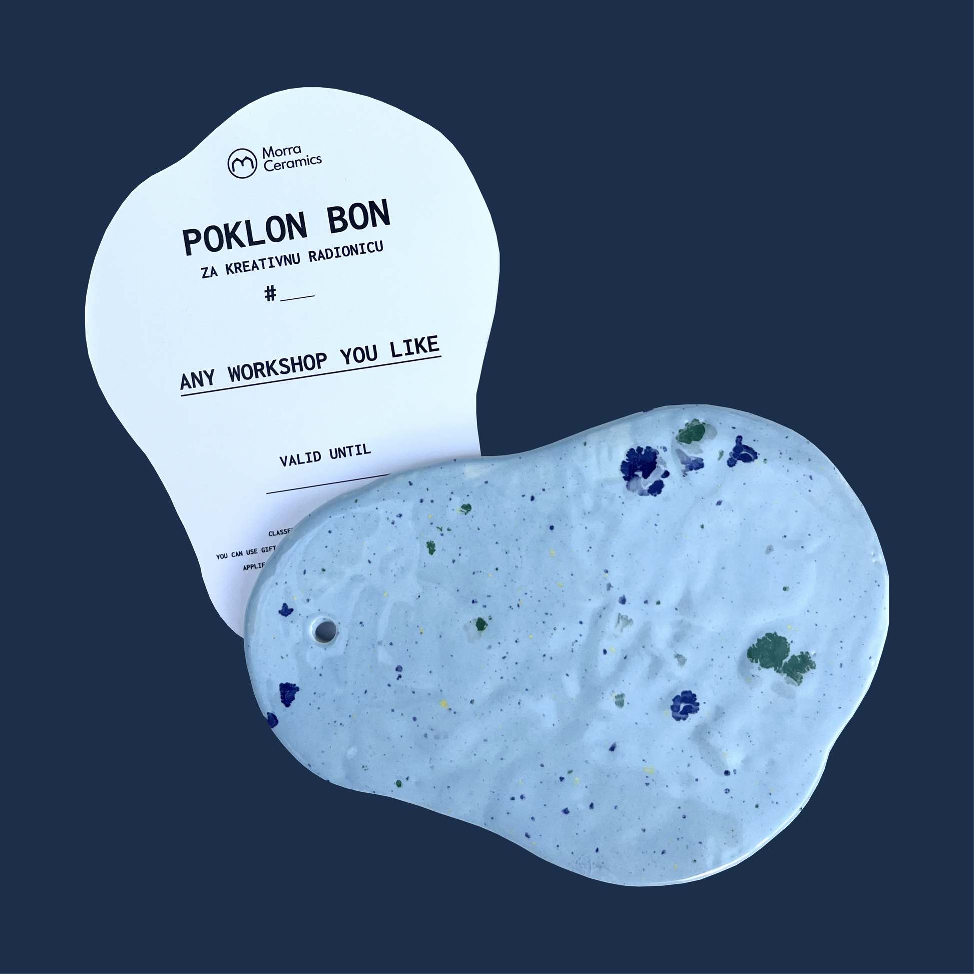 Ovo nije samo komad papira – to je prekrasno izrađena keramička pločica koja služi i kao podmetač za svijećnjake ili elegantan pladanj za nakit. Primatelj se može pridružiti bilo kojoj radionici koju organizira Morra Ceramics i iskusiti praktičnu kreativnost iz prve ruke.